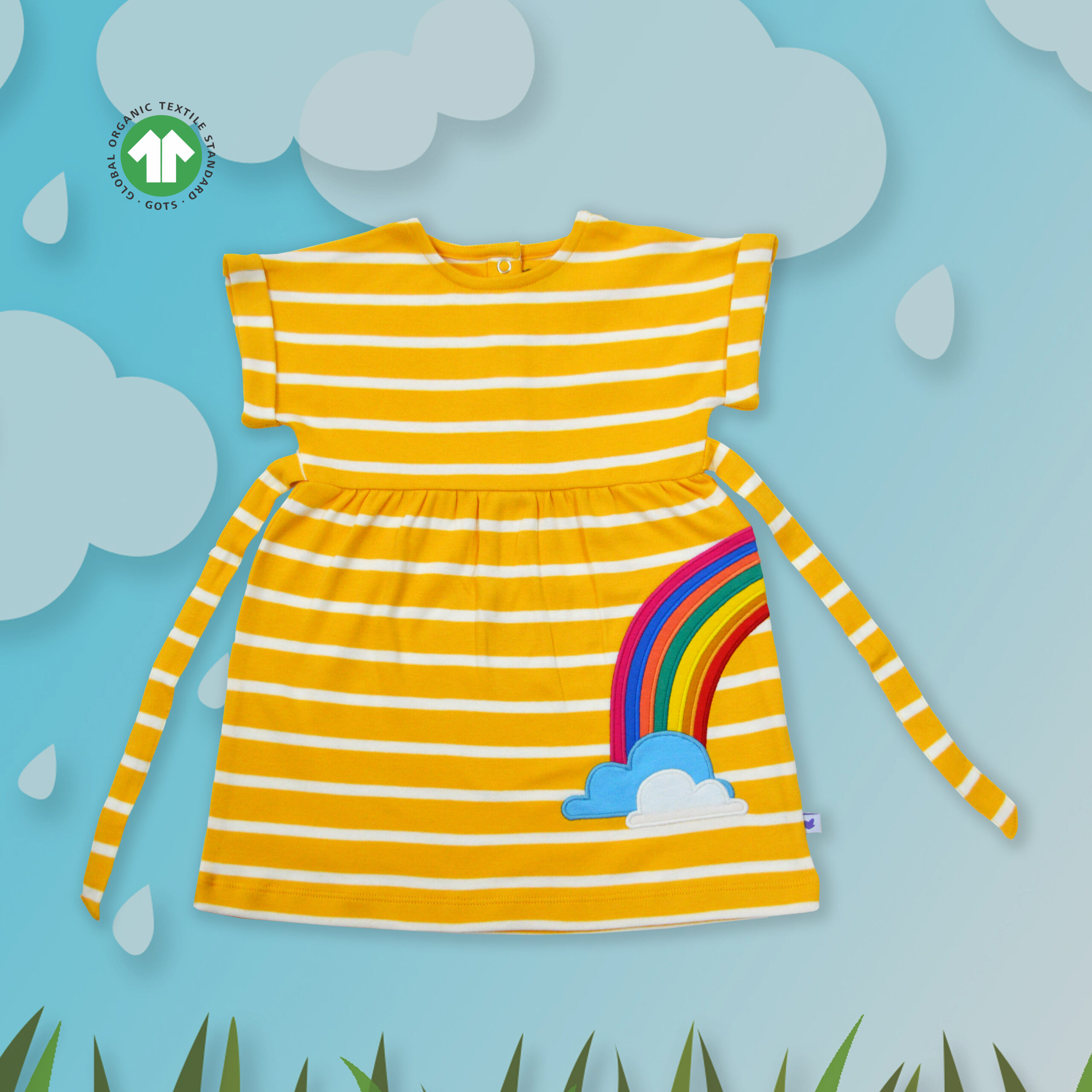 Fashionable Baby Wear for Girls 100% Organic Cotton Stripe Yoke Frock with Rainbow Embroidered – Yellow