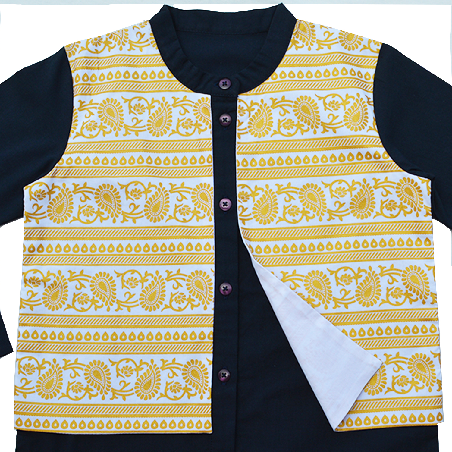Boys Kurta with Golden Printed Attached Jacket & Pyjama-Navy