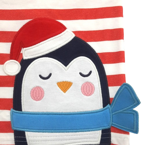 The full sleeves provide extra warmth, making it perfect for the winter season and adding a touch of festive magic to bedtime. Crafted with care, the set features delightful winter and Christmas-themed designs like red and white stripes and penguin emb on it that your kids will adore. also feet of penguin embroidered on Bottom.